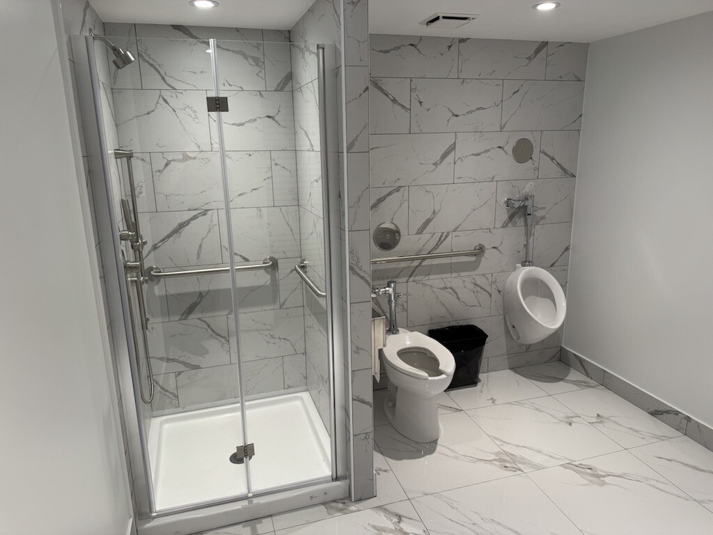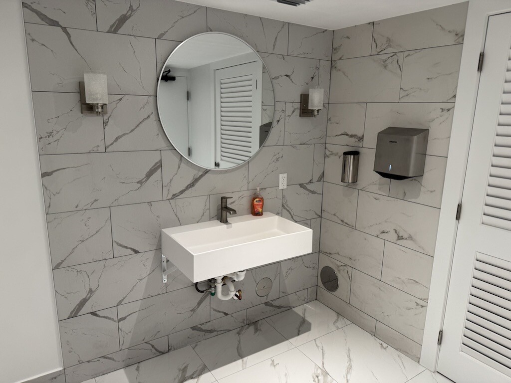 We completed a full renovation that reconfigured the space for modern use. The men’s and women’s bathrooms were combined into an updated unisex restroom, and part of the area was converted into a management office. New lighting, finishes, and systems were added to meet current codes and ensure long-term functionality.