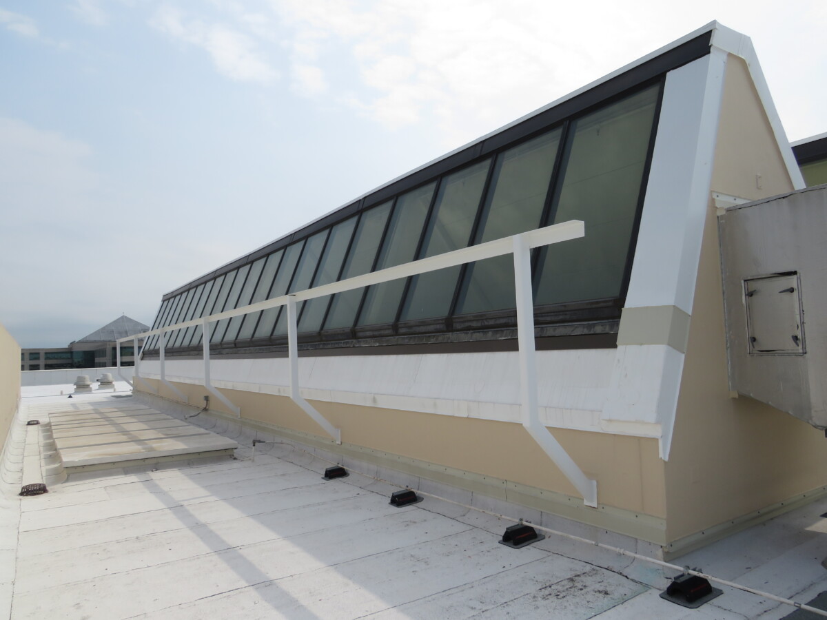 New roofing materials were installed at the main guestroom tower, elevated towers, and atrium skylight. Repairs were also performed at the atrium skylight wall, glass, and roof surfaces. The interiors of the building are no longer leak.
